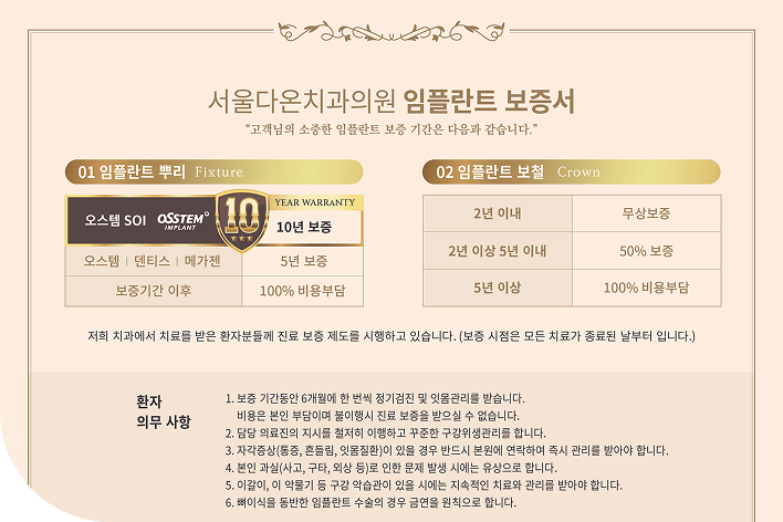 환자분께 드리는 약속이자, 임플란트에 대한 강한 자신감의 표현입니다.